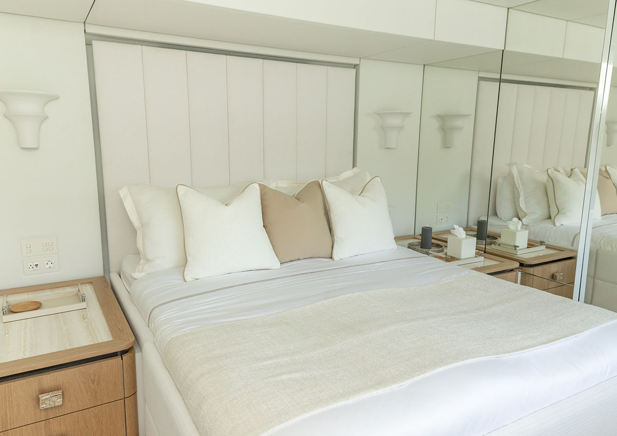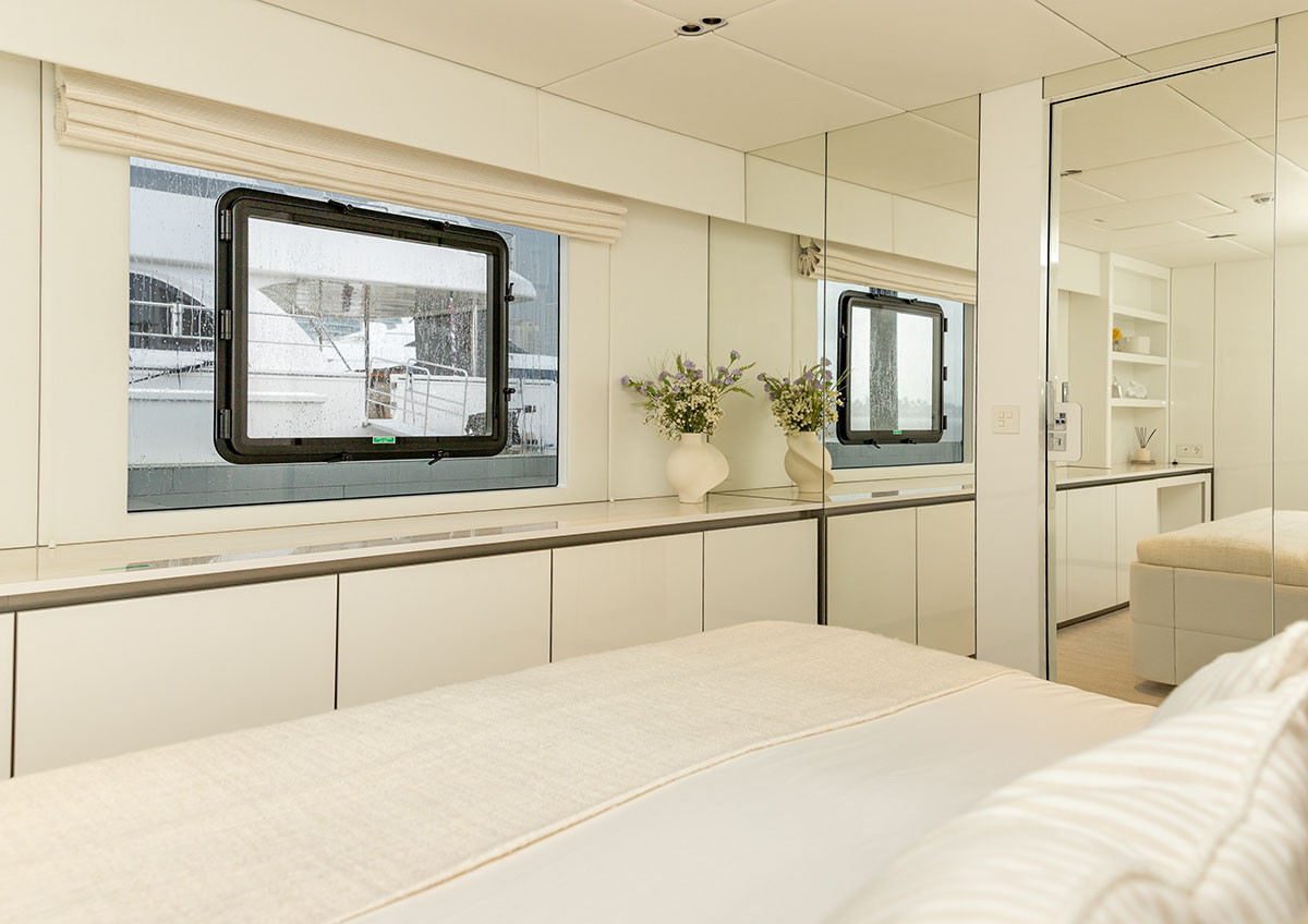 The full-beam master suite occupies a prime position on the lower deck, offering exceptional privacy and comfort. It features a king-size berth, generous storage, a dedicated seating area, and a spacious en-suite bathroom. Large hull windows provide abundant natural light and panoramic views, enhancing the sense of space and connection to the sea.
