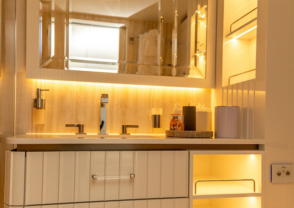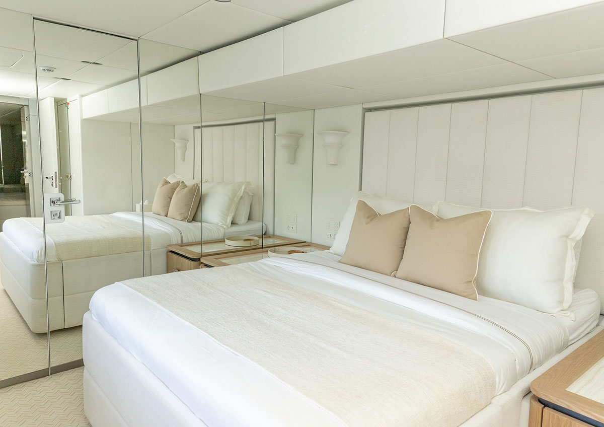 Three additional guest cabins complete the accommodations: two oversized doubles and one twin, each with private en-suite facilities. The design emphasizes both comfort and functionality, with ample wardrobe space, refined finishes, and discreet lighting. All guest cabins are located on the lower deck, ensuring a quiet and restful environment.